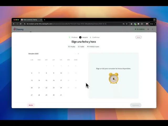 Te indicamos como programar tu primera experiencia en Clasing. Programa y disfruta de tu Clase de Prueba de 25 Minutos 1 to 1 con un profesor nativo.