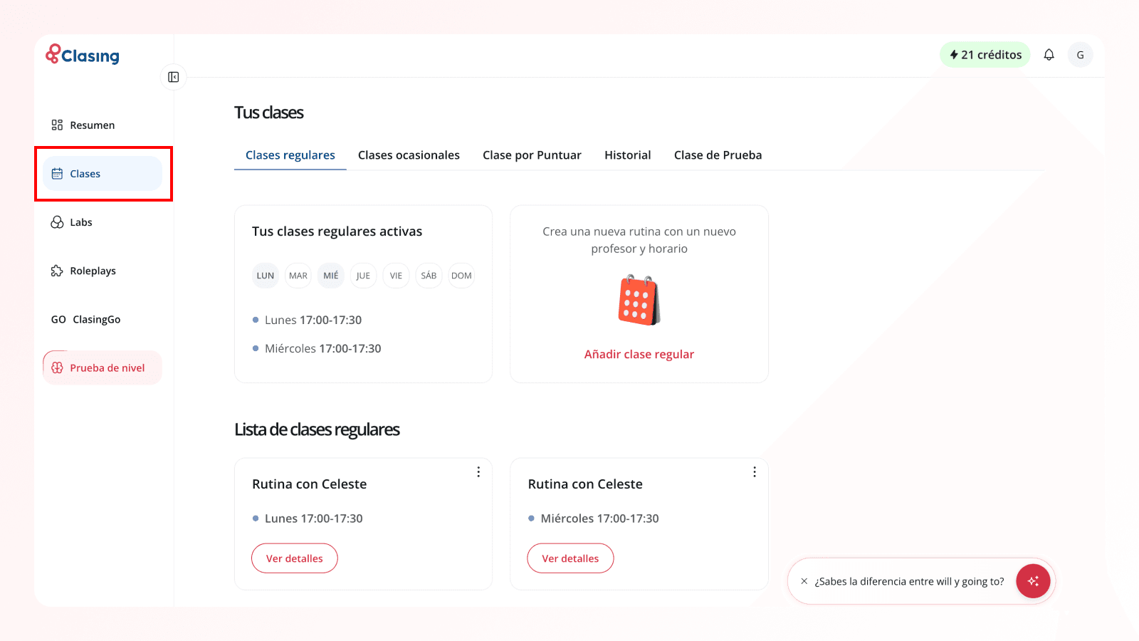 En caso de que si tengamos Clases Rutina (Clases Regulares) programadas, veremos varios elementos. Veremos una caja con el título "Tus rutinas activas" que nos indicará que días de la semana y a que hora tenemos programadas nuestras clases. Por ejemplo: Si tienes una Rutina (Clase Regular) programada los lunes a las 10:00 a 10:30 con Teacher Abby, esta sección te marcará el lunes de color y te indicará que tienes clases los lunes de 10:00 a 10:30. Es importante entender que esto significa que tienes clase TODOS los lunes a esa misma hora con esa teacher (en caso de querer clases puntuales con un fecha y hora concreto deberías utilizar las clases ocasionales).