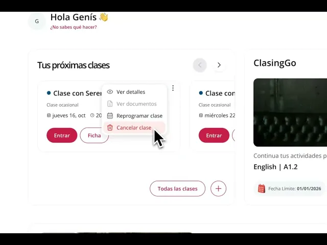 También, en la pantalla "Clases" del menú lateral izquierdo, podrás acceder a la pestaña "Clases Ocasionales" y allí podrás ver todas tus clases programada. Podrás cancelar la la clase desde el menú desplegable del icono de los 3 puntos de la parte superior derecha de la tarjeta de clase o desde la página de información de la clase (accesible desde el botón "Ficha" de la propia tarjeta.