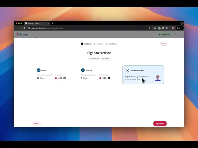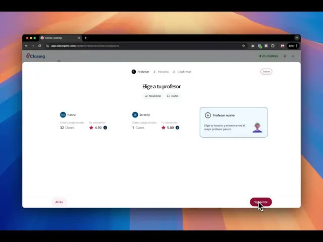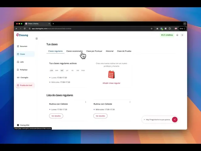 Si no quieres estar atado a un horario fijo, las Clases Ocasionales son perfectas para ti. Te permiten escoger un profesor, un día y una hora y disfrutar de una clase de 30 o 60 minutos sin ninguna otra atadura. Puedes programar Clases Ocasionales desde la página "Resumen" en tu barra lateral izquierda. También puedes hacerlo desde la página "Clases" de tu barra lateral izquierda y en la pestaña "Ocasionales".
